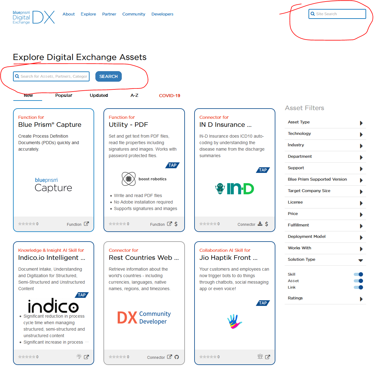 There is a site search bar at the top right and there is an asset/partner/category search bar on the left side. Both seem to now return the same results, so I'm envisioning one universal search bar.